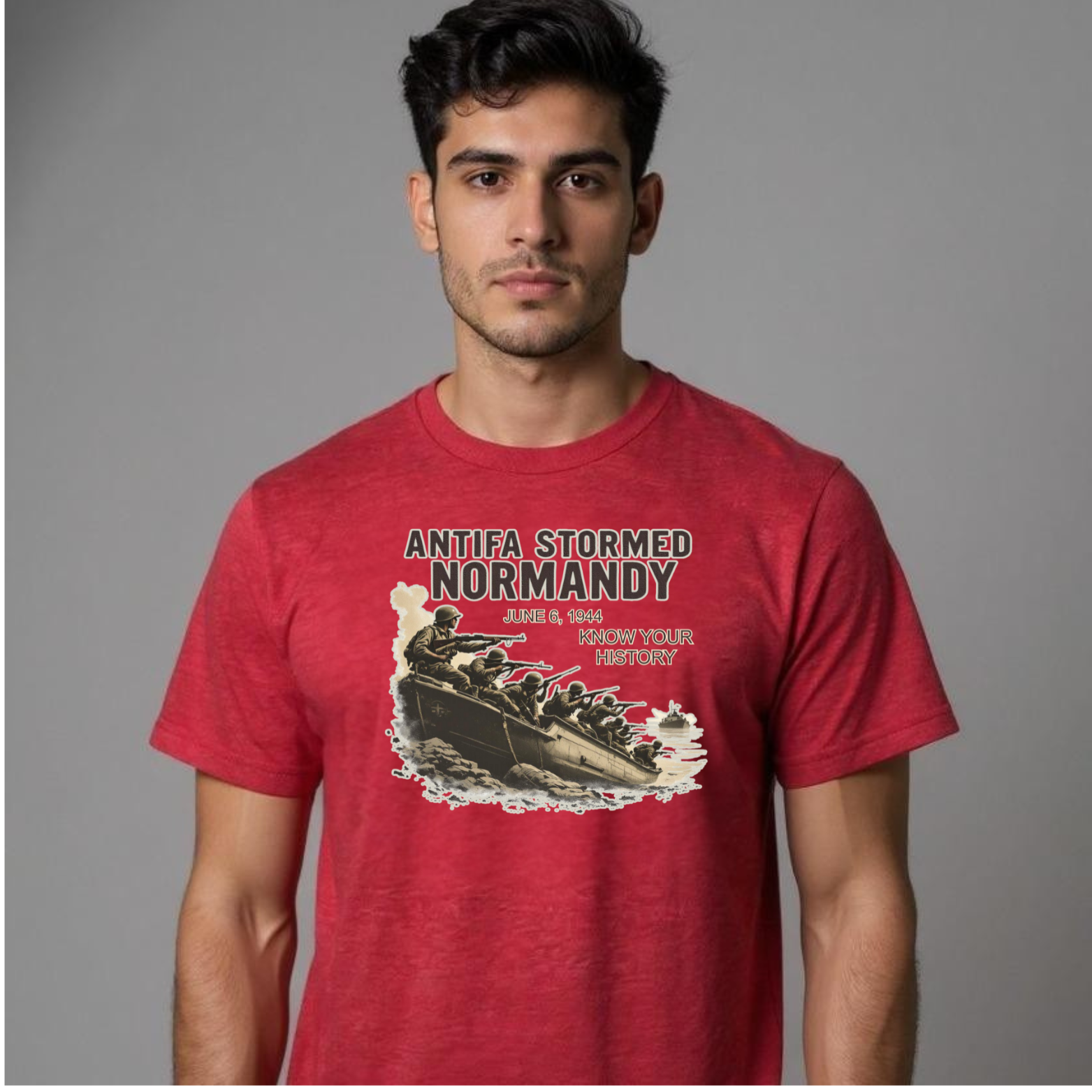 This graphic t-shirt brings history to the forefront with a striking illustration inspired by the Normandy landings of World War II. The design blends vintage military artwork with a modern message that encourages people to reflect, question, and truly understand the past.
