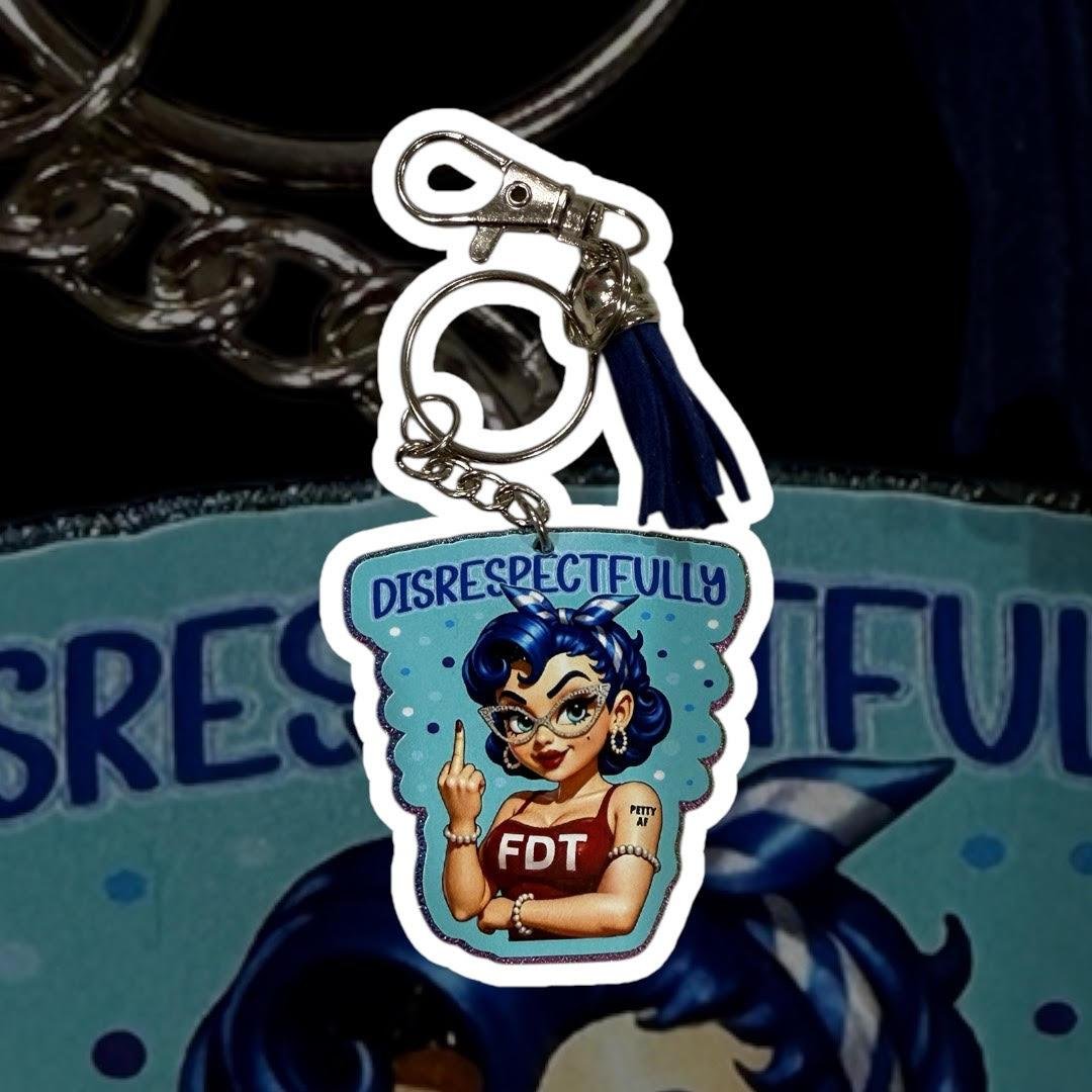 This Christina Talks Tea collaboration keychain features a retro-inspired character delivering the message loud and clear — Disrespectfully — with an unapologetic FDT statement and classic Christina energy. From the crossed arms to the raised finger, every detail serves attitude with a side of humor.