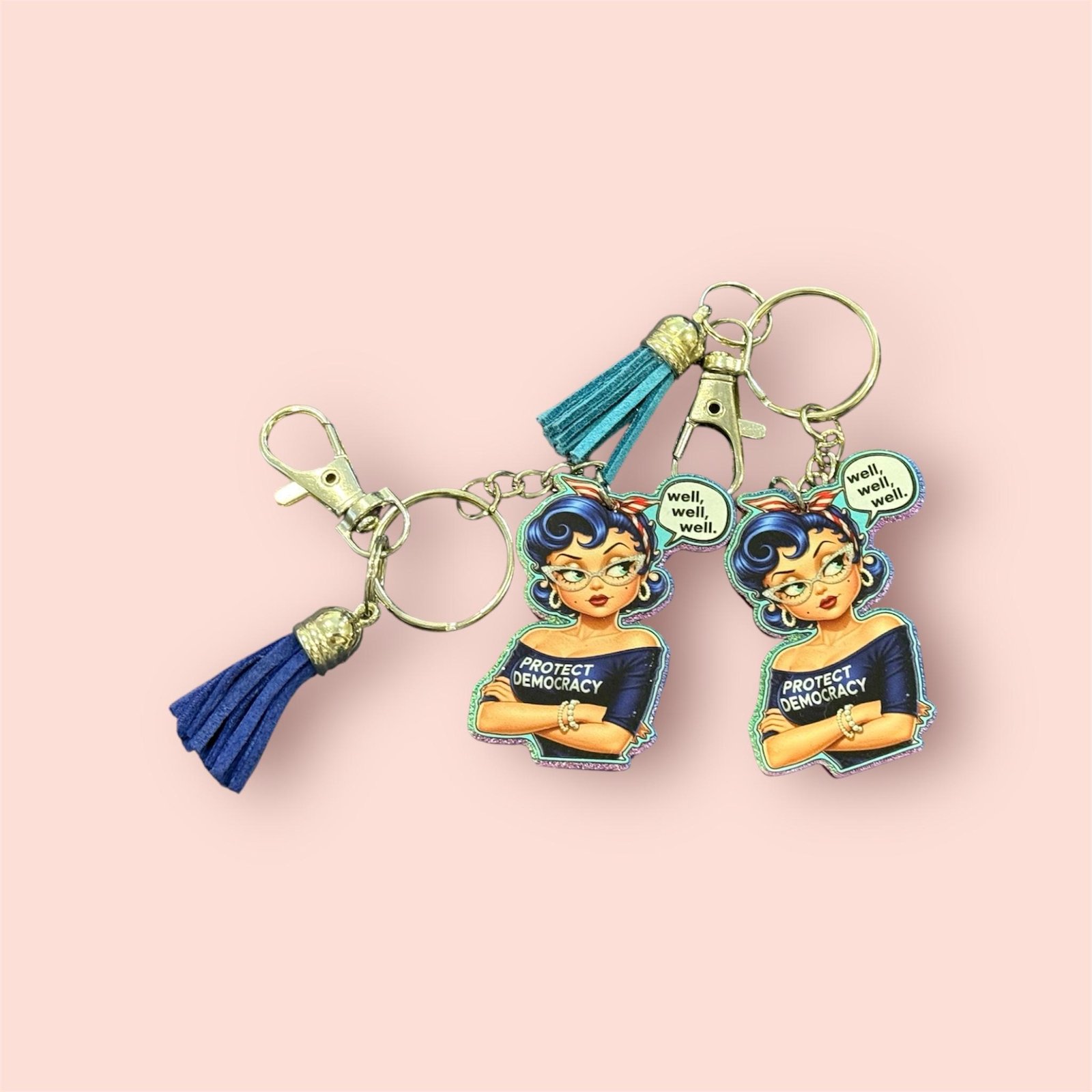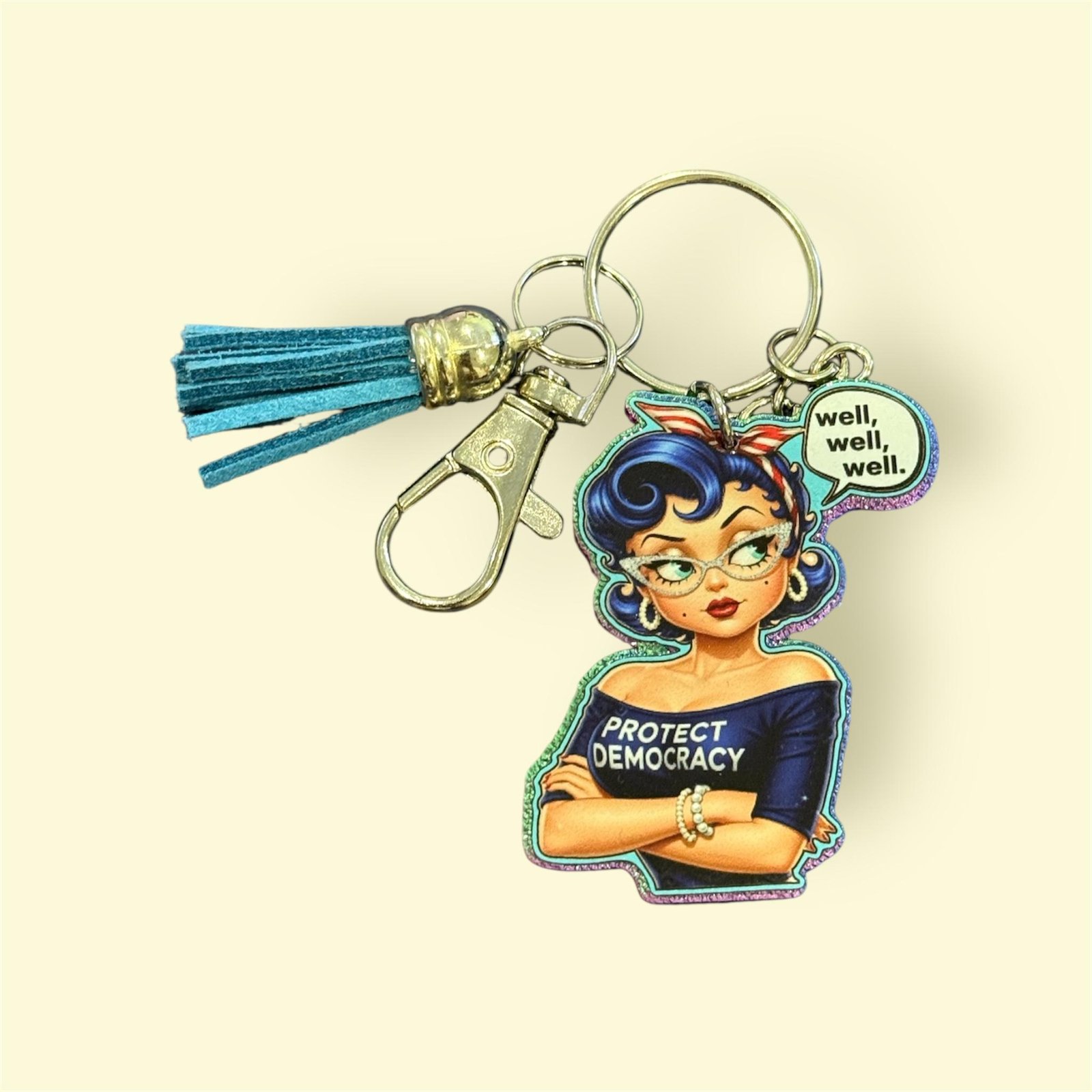 Part of the Christina Talks Tea collaboration, this statement keychain features a retro-inspired character serving classic side-eye, paired with the unmistakable phrase “Well, well, well” and a bold Protect Democracy message. It’s playful, pointed, and perfectly on brand for Christina’s signature tone.