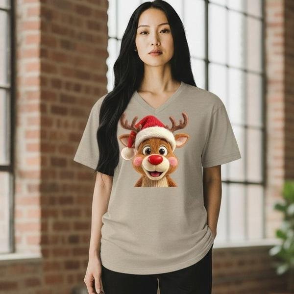 This festive graphic t-shirt features an adorable reindeer face wearing a classic Santa hat, designed to instantly bring warmth and holiday spirit to any outfit. With bright eyes, rosy cheeks, and a friendly expression, this design delivers a cheerful Christmas vibe without extra text or clutter.