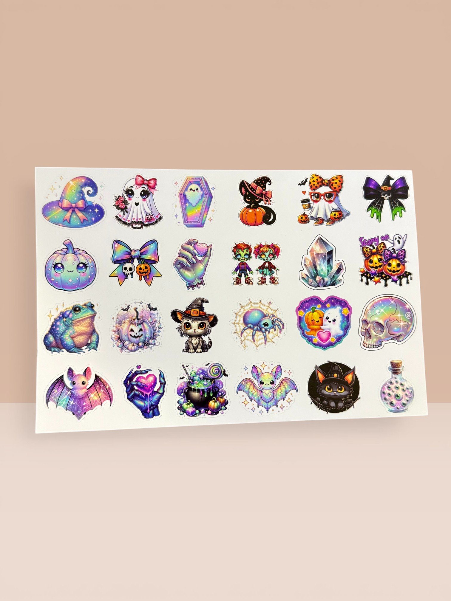 This Halloween-inspired vinyl sticker pack blends playful charm with just the right touch of eerie fun. Each sheet features 24 unique designs, including ghosts, pumpkins, bats, crystals, potion bottles, magical creatures, and other whimsical spooky icons.