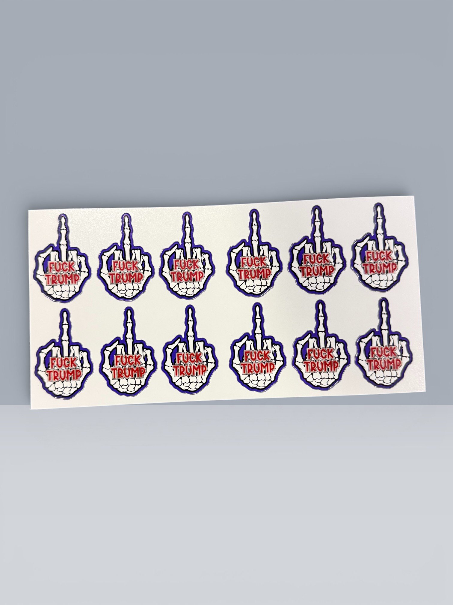 This “F*ck Trump” vinyl sticker features a detailed skeleton hand flipping the middle finger, paired with bold, high-contrast lettering across the palm. The graphic has a sharp, edgy style that gives it strong visual impact without overcomplicating the message.