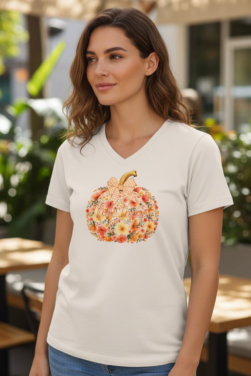 Celebrate the cozy spirit of fall with this beautifully designed t-shirt featuring a detailed pumpkin surrounded by delicate florals and finished with a charming bow accent. The “F*ck Trump” script adds a playful, conversation-starting touch that blends seasonal fun with personality.