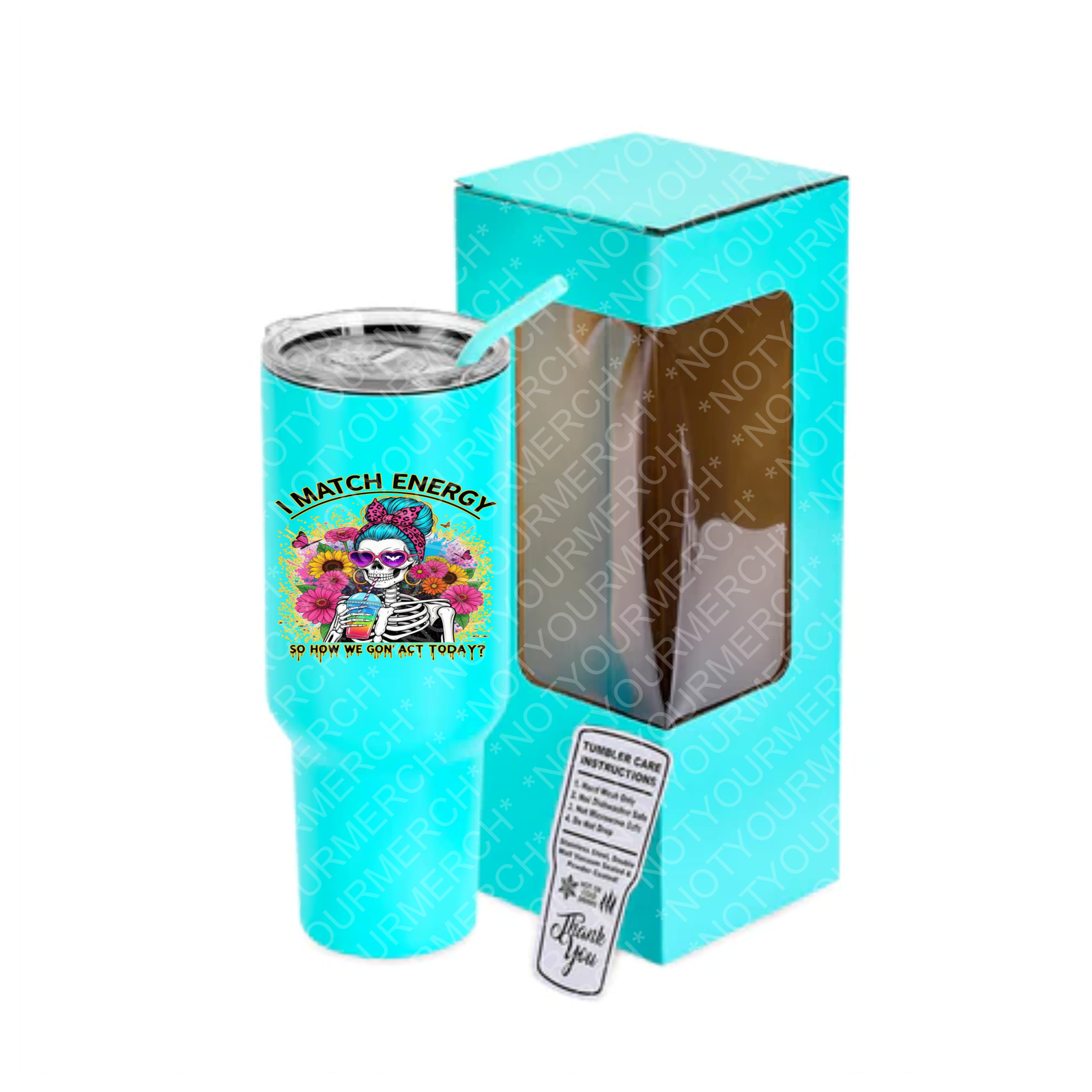 This eye-catching tumbler features a confident skeleton rocking oversized sunglasses, holding a colorful drink, and surrounded by vibrant floral details. The phrase “I Match Energy – So How We Gon’ Act Today?” sets the tone loud and clear: you’re bringing the same vibe that’s given to you.