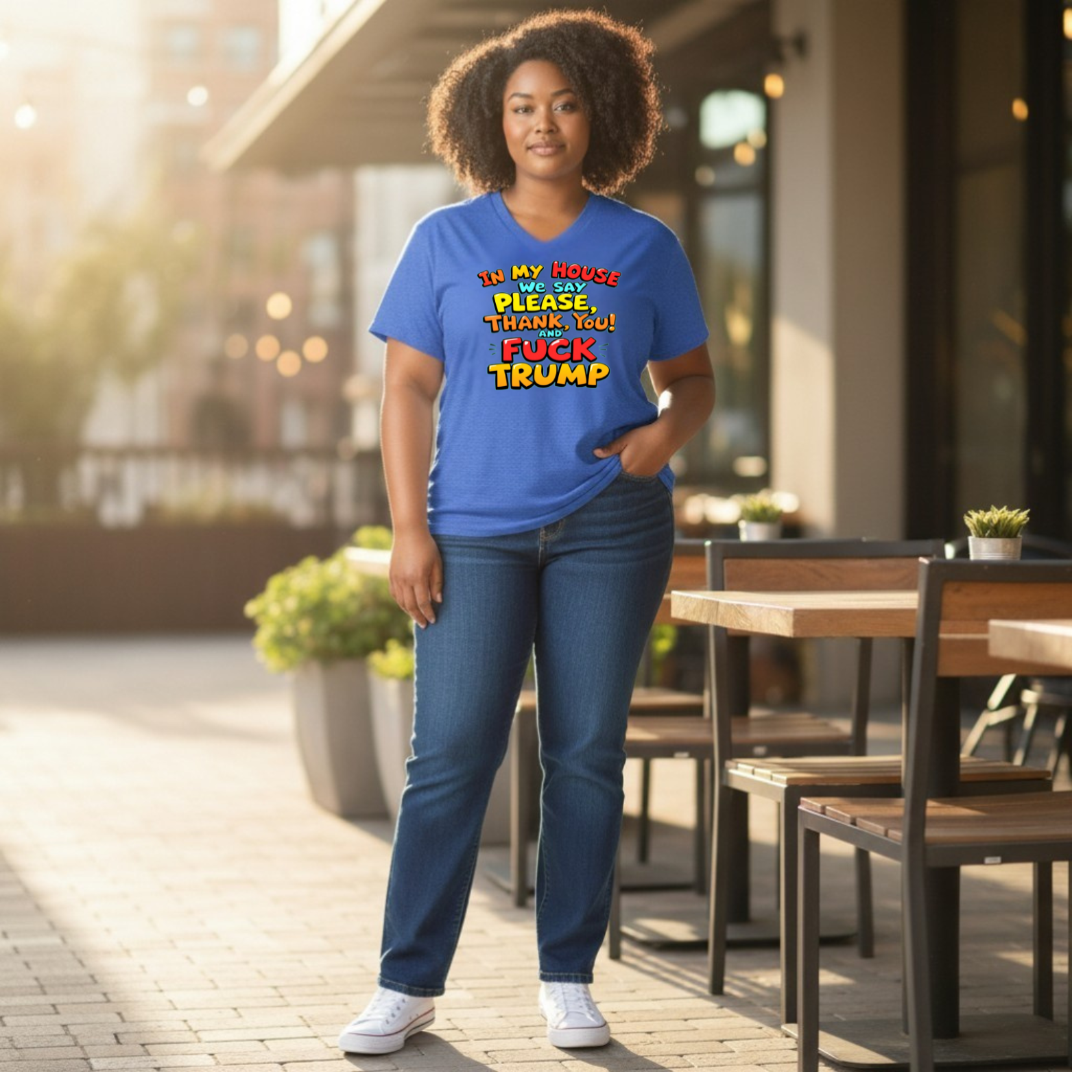 With its cartoon-style typography and vibrant color palette, the shirt contrasts politeness and profanity to make a clear point: respect matters — and so does speaking out. The design is intentionally eye-catching, easy to read, and meant to spark conversation.