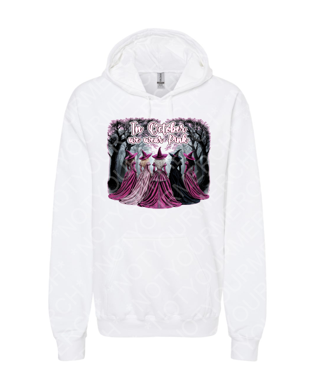 This graphic hoodie blends seasonal mystique with a powerful message of support and unity. The front artwork features a group of witches standing together beneath bare trees, paired with a well-known October awareness phrase rendered in an elegant, hand-lettered style. The imagery symbolizes collective strength, resilience, and standing together during breast cancer awareness season.