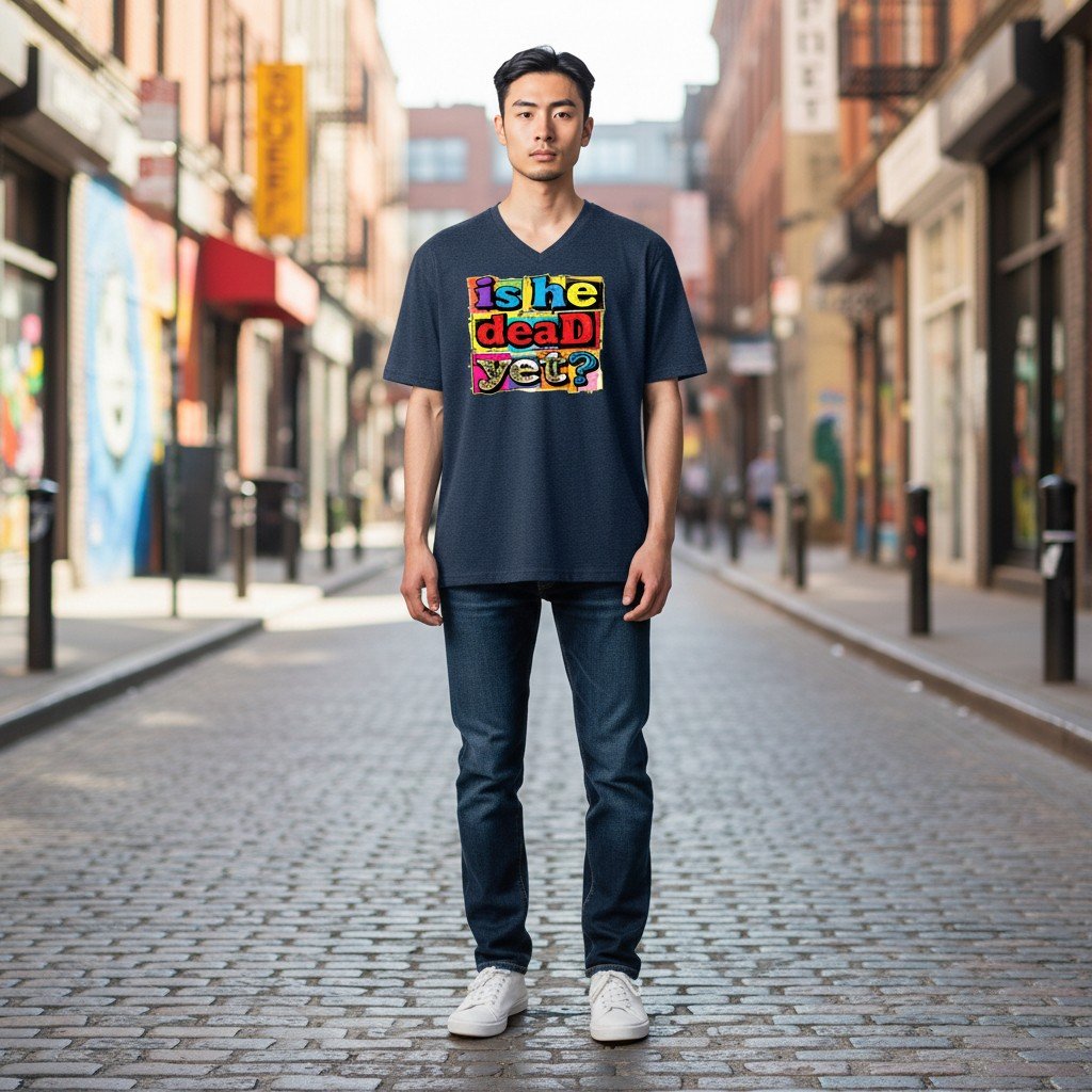 Not every shirt is meant to be subtle. The Is He Dead Yet? graphic V-neck T-shirt leans into sharp humor and expressive design, making it perfect for anyone who enjoys edgy statements with personality.