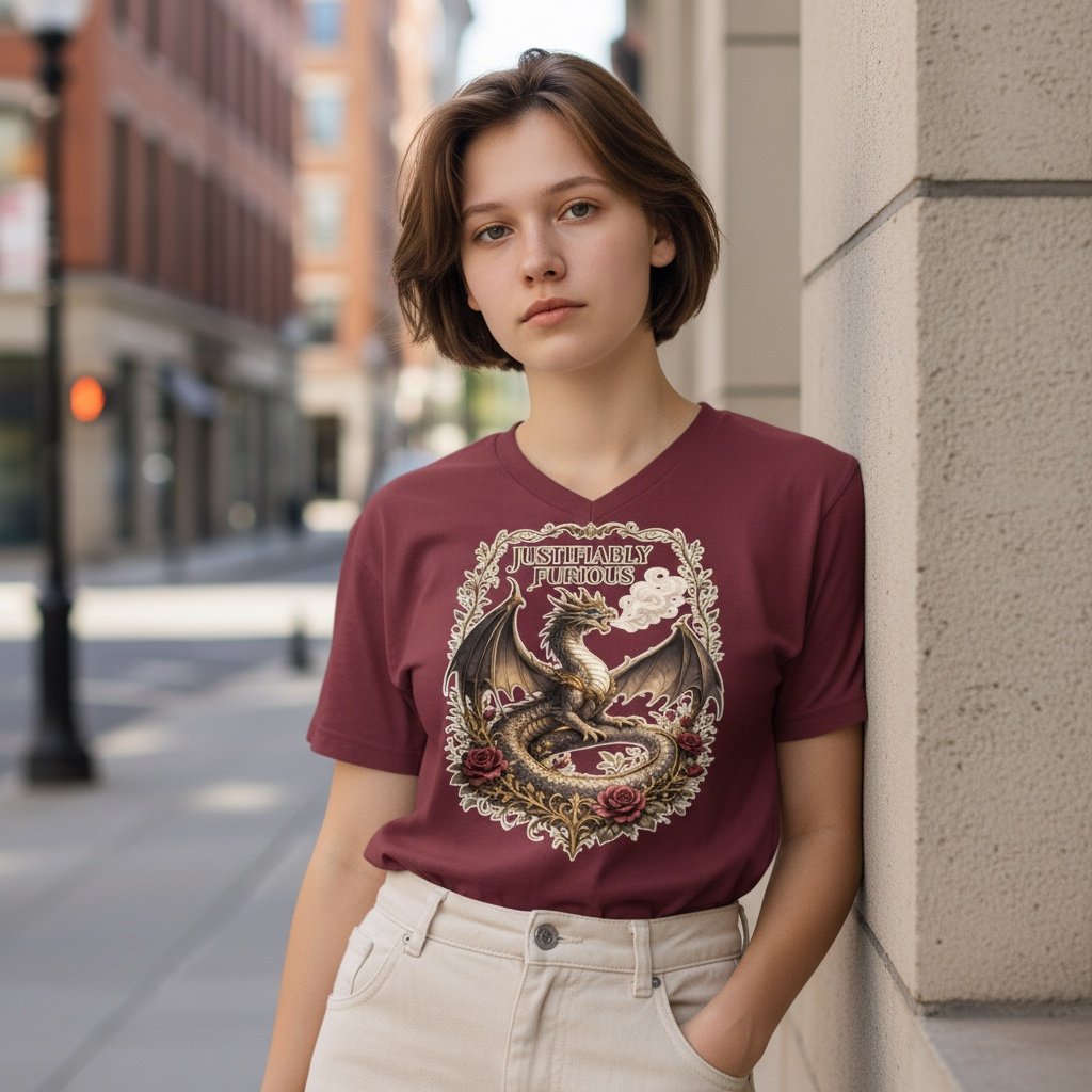 This design features a beautifully detailed dragon surrounded by ornate decorative elements and floral accents, creating a dramatic fantasy-inspired look. The phrase “Justifiably Furious” adds a bold attitude to the design, making it perfect for anyone who embraces their fierce side.