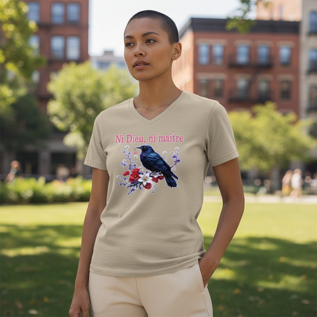 A striking graphic V-neck T-shirt featuring a detailed raven illustration with floral elements and the phrase “Ni Dieu, ni maître.” Soft, comfortable, and designed for everyday wear with artistic character.