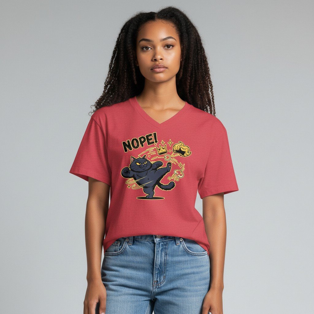 This V-neck t-shirt brings personality front and center. The design features a confident, animated cat mid–kung fu move paired with a bold “NOPE!” message that says everything without saying too much. It’s fun, expressive, and made for people who appreciate humor with a bit of sass.