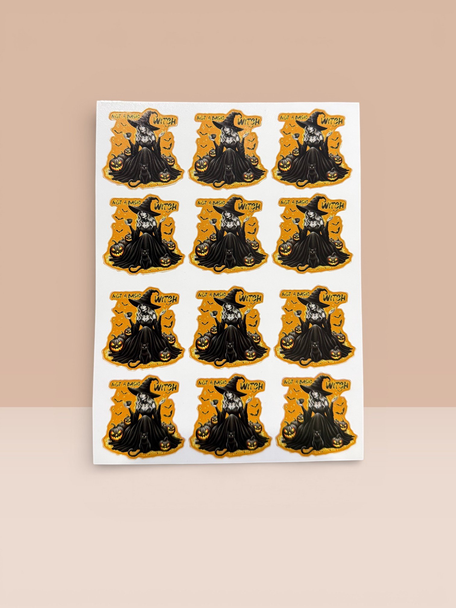 This “Not A Basic Witch” vinyl sticker design features a striking gothic witch seated among pumpkins, bats, and a watchful black cat. The artwork blends dark elegance with Halloween charm, creating a design that feels both mysterious and confident.