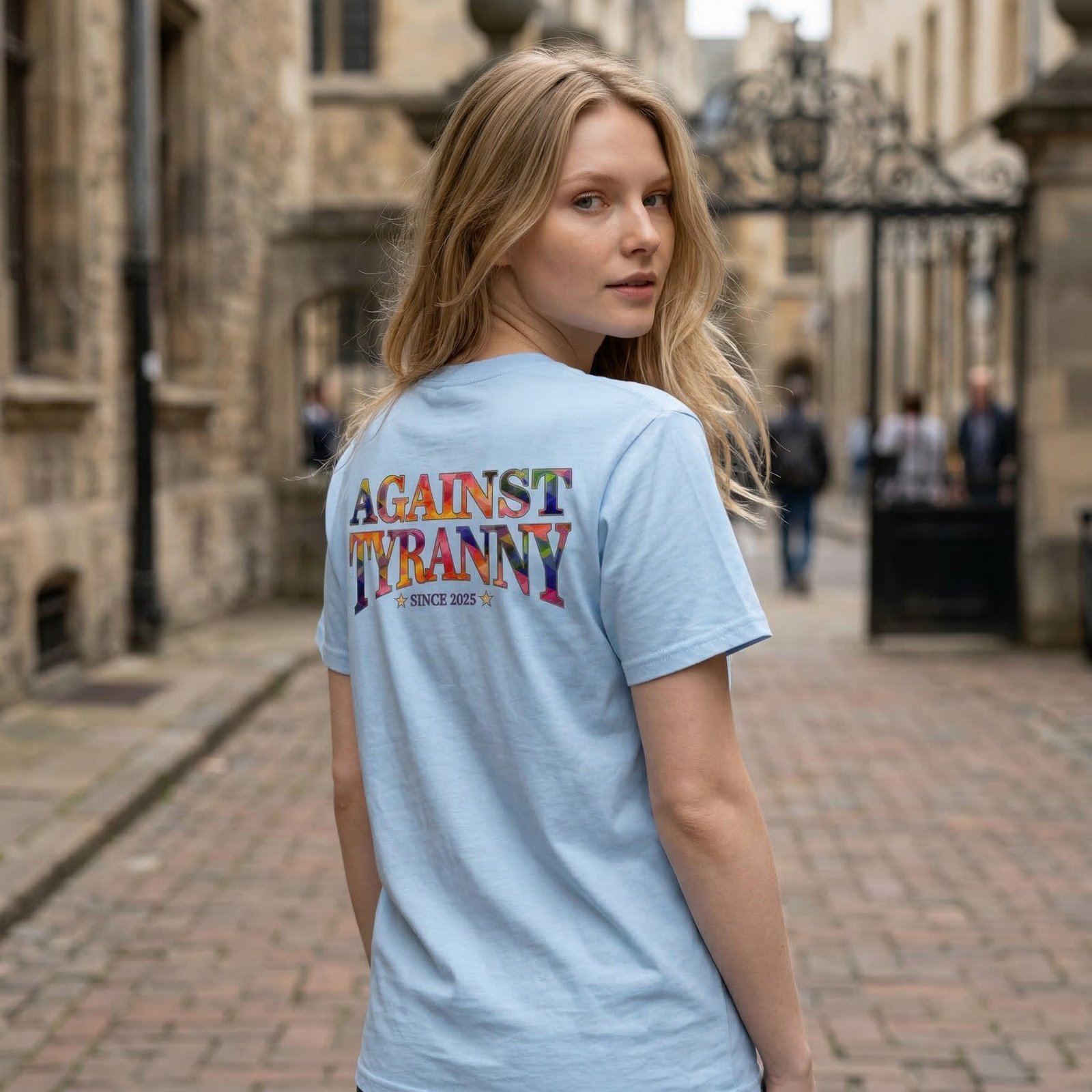 On the back, the design expands with the Against Tyranny β Since 2025 graphic, creating a powerful two-sided visual that carries the message from every angle. The artwork gives the shirt a collectible feel while still being easy to wear casually.