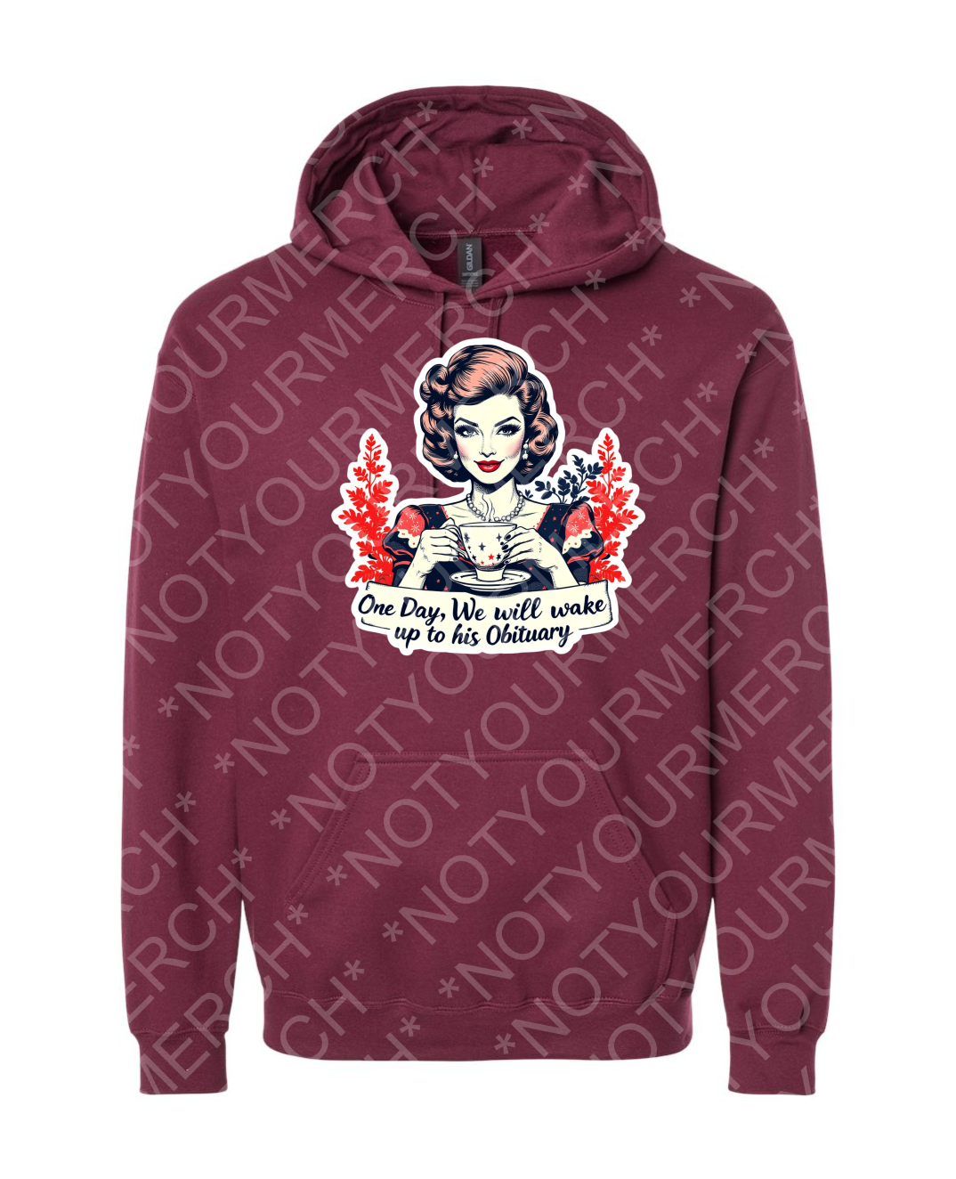 This hoodie blends retro charm with sharp political satire. Featuring a vintage-style illustrated woman calmly holding a cup alongside the phrase “One day, we will wake up to his obituary,” the design delivers its message with quiet confidence and unmistakable edge.