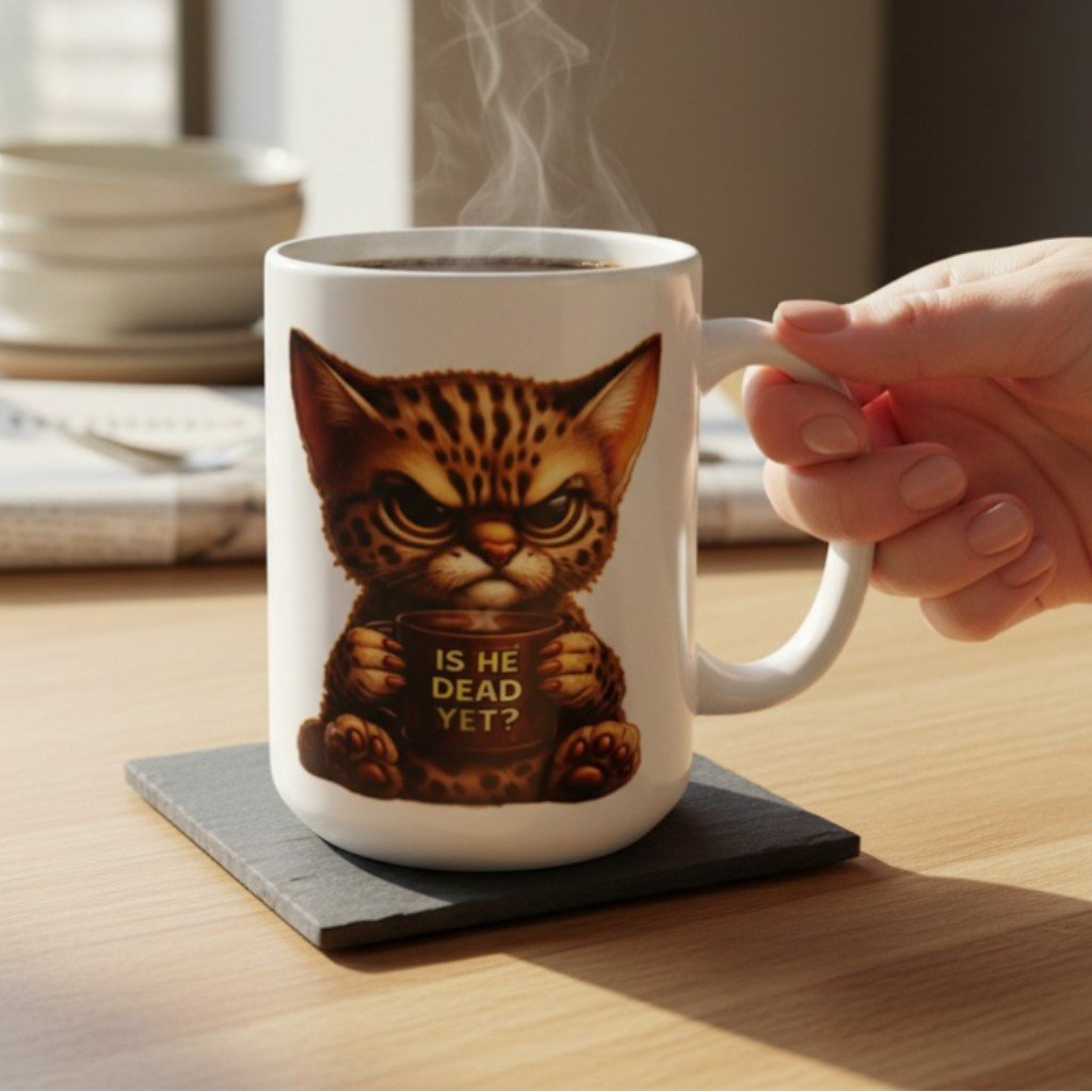 This funny 15oz coffee mug features Prison Cat holding a tiny mug with the blunt phrase “Is He Dead Yet?”, perfectly capturing that mood when patience is gone and caffeine hasn’t kicked in yet.