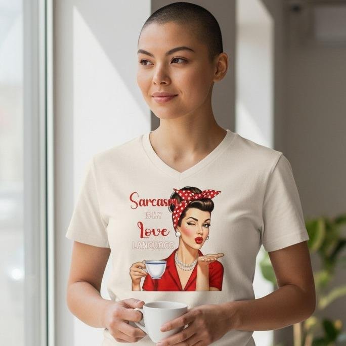 This playful graphic t-shirt features a retro-inspired illustration paired with the phrase “Sarcasm Is My Love Language.”The expressive artwork and confident pose give the design a bold personality while keeping the layout clean and easy to wear.