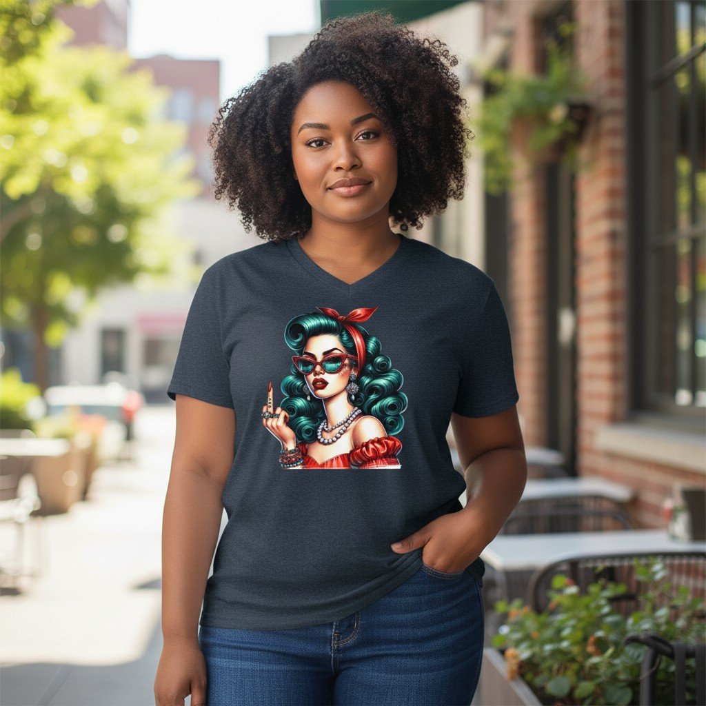 This graphic t-shirt features a striking retro pin-up illustration with confident attitude and classic mid-century styling. From the expressive pose to the polished details, the design channels vintage glamour with a modern, rebellious twist.