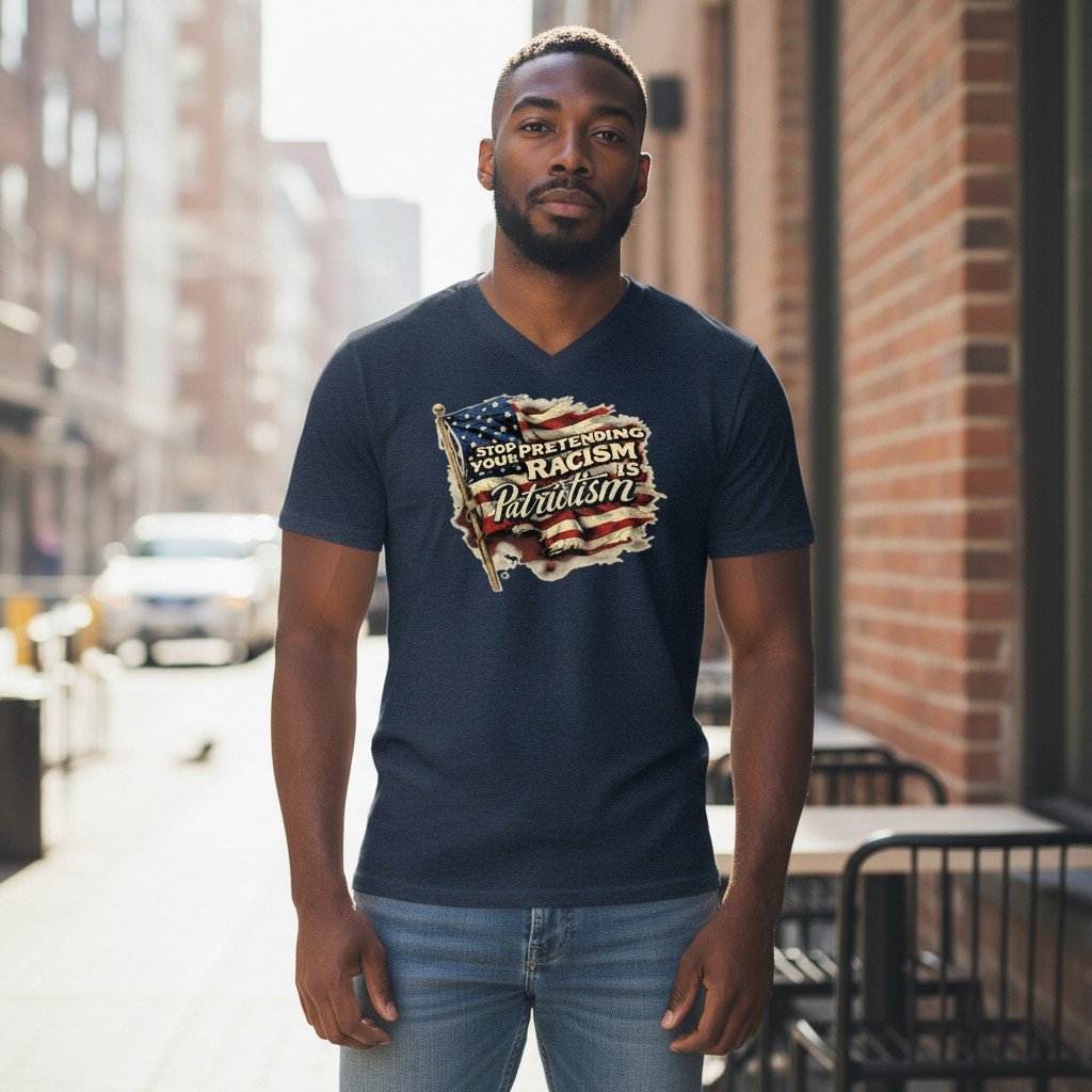 A bold statement graphic t-shirt featuring a distressed flag-style illustration and the phrase “Stop Pretending Your Racism Is Patriotism.” Designed for comfort, clarity, and unapologetic self-expression.