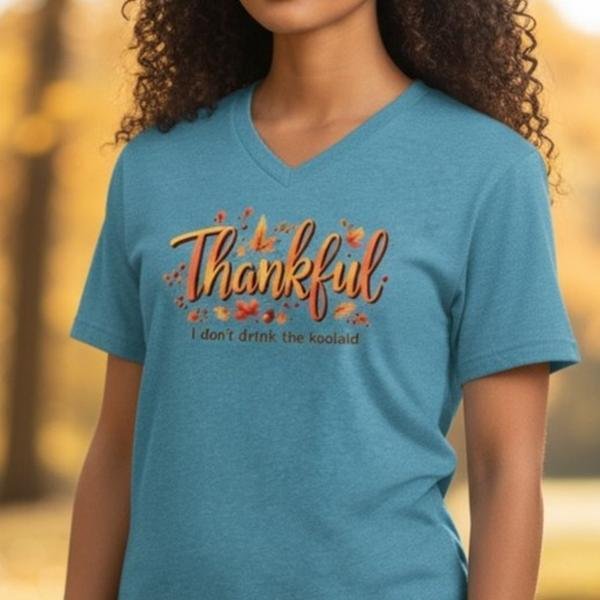 This graphic t-shirt blends a cozy fall vibe with a sharp, thoughtful message. Featuring decorative autumn-inspired lettering and subtle seasonal accents, it’s designed for people who value gratitude and critical thinking.
