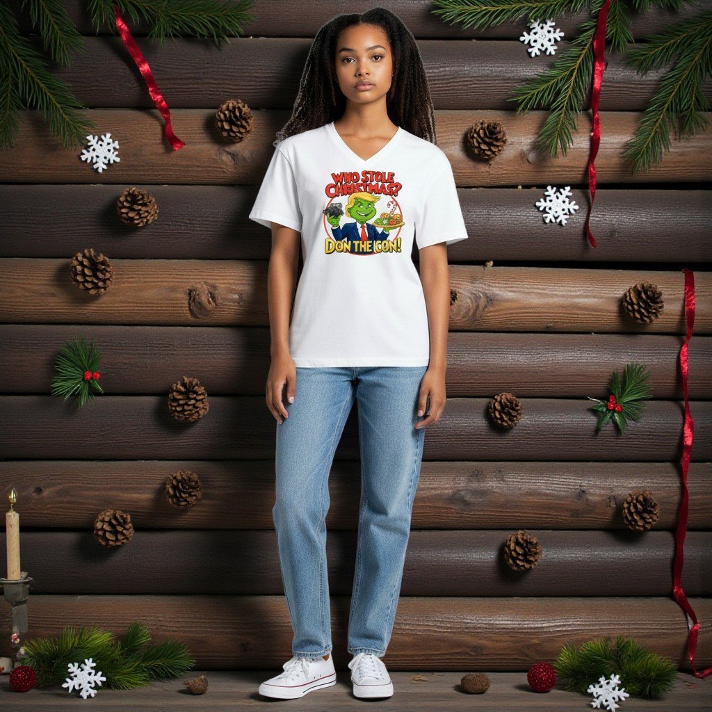 This graphic T-shirt delivers holiday humor with a bold edge. Featuring a cartoon-style character inspired by classic seasonal mischief and paired with the phrase “Who Stole Christmas? Don the Con!”, the design uses satire to make a statement that’s playful, pointed, and unmistakable.